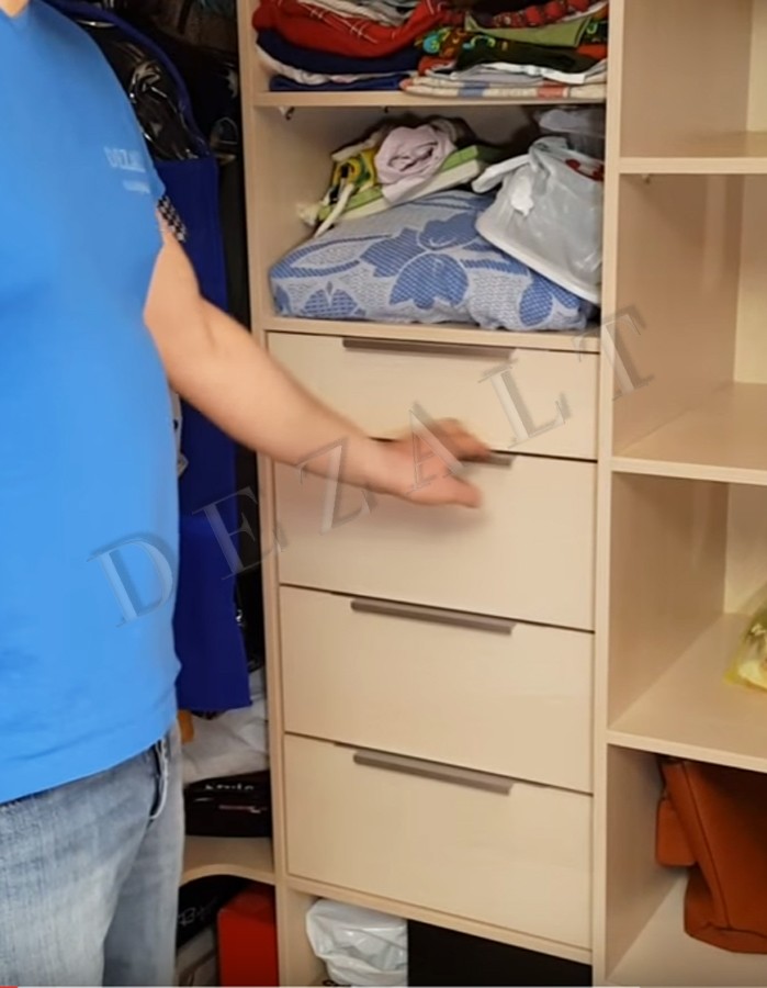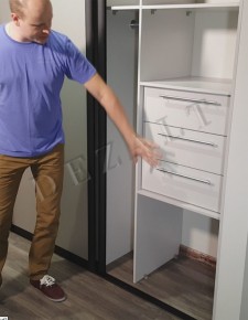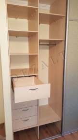 Наш основной вид деятельности, изготовление шкафов купе и гардеробных. Выдвижные ящики находятся внутри шкафа, буквально в нескольких сантиметрах от дверей купе. Для того чтобы сэкономить полезную площадь ящика, некоторые клиенты просят установить врезную ручку.