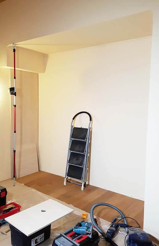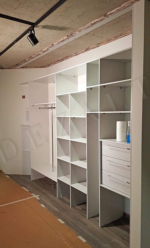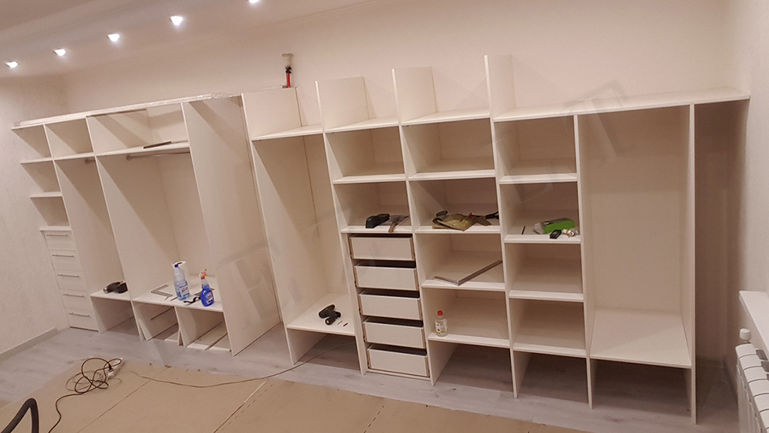 Задача прямо скажем сложная, потому что упираемся в вечную проблему — шкаф-купе не умещается в кадр. Мы просмотрели все наши работы и отобрали серию фотографий шкафов-купе и гардеробных по такому принципу: пустая стена, каркас, готовый фасад.