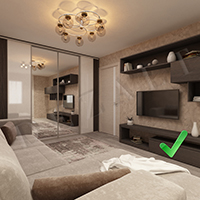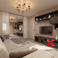 Приведём другой пример, с мебелью: дверь нейтрального цвета расположена в визуальном центре, справа стенка под телевизор темного цвета, слева шкаф с темными вставка и нейтральным цветом двери. В таком варианте ничего визуально не перевешивает.