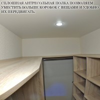 Обязательно подумайте об освещении, лучше поставить мощный светильник в центр гардеробной. Антресольные полки отрежут часть светового потока сверху, станет в два раза темней, учтите это.