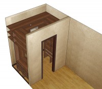 Если у вас гардеробная будет находиться в отдельном помещении с межкомнатной дверью, желательно сделать вентиляционные отверстия. По правилам их должно быть два, одно низко у входной двери, второе на противоположной стене под потолком. Нужно чтоб воздух циркулировал по комнатам, иначе вещи будут «задыхаться», портиться от запахов.