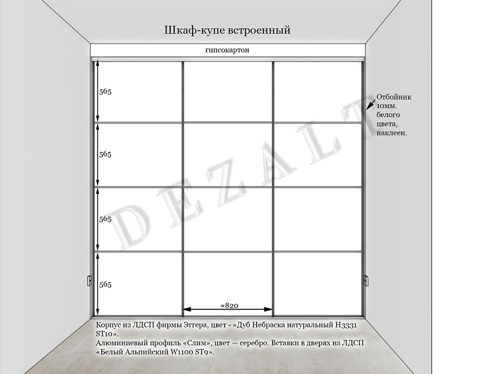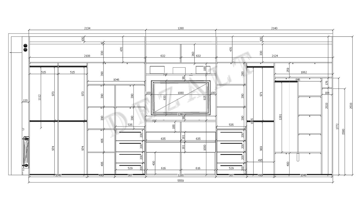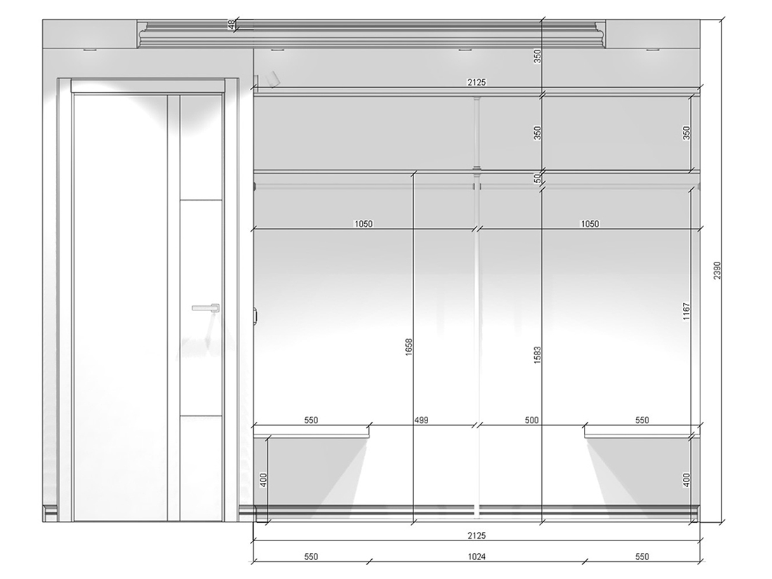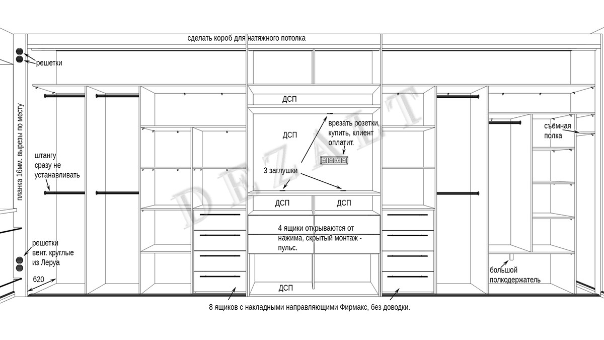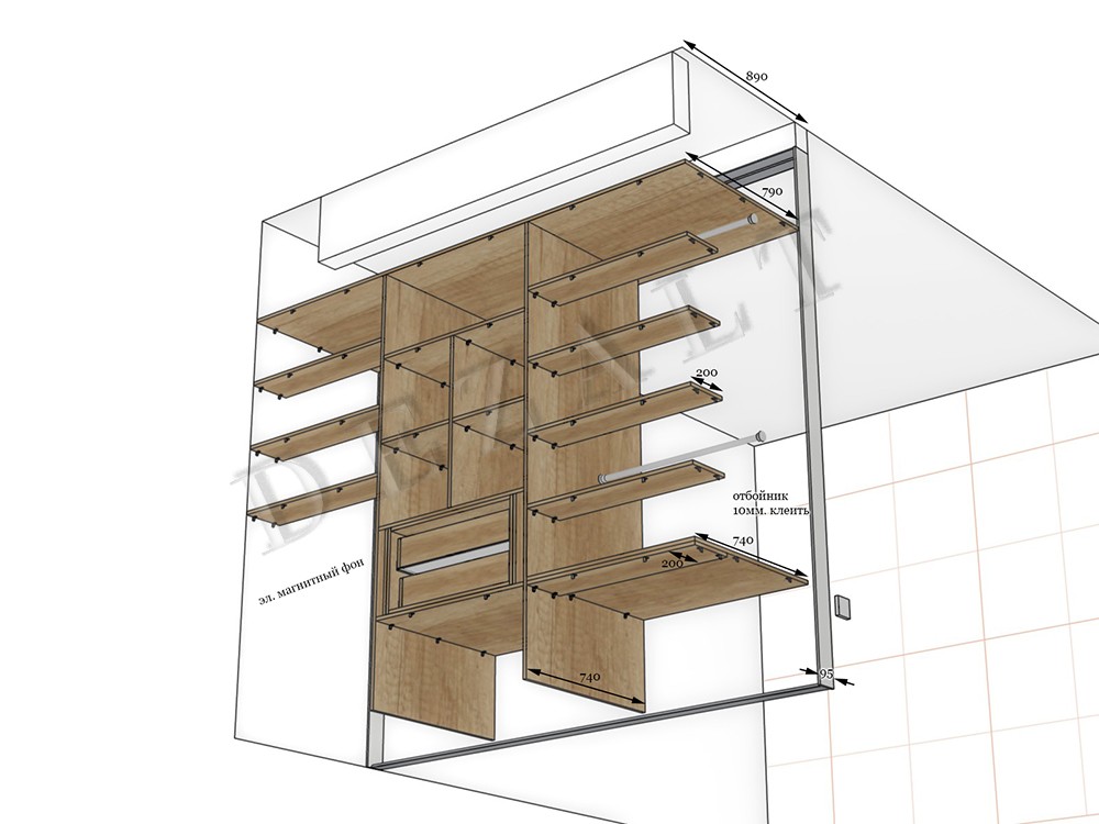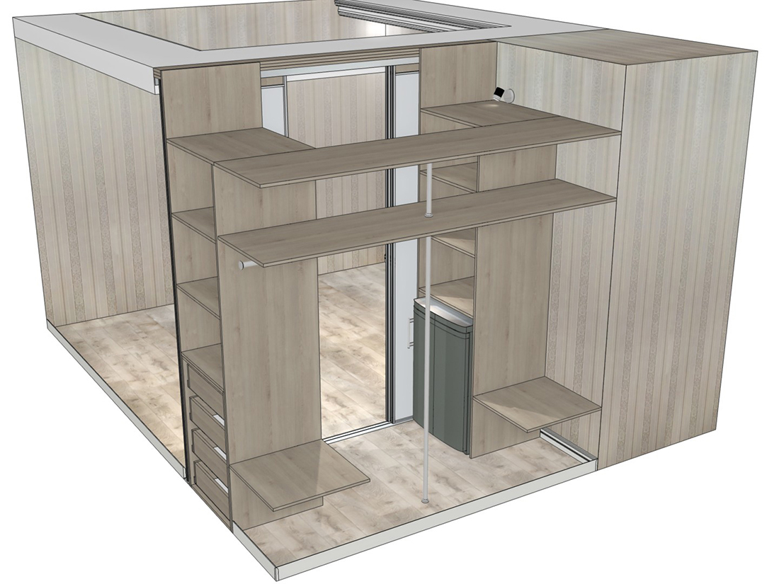 Вы получаете новые чертежи с небольшими доработками, как правило речь идет буквально о нескольких сантиметрах. Мы просто подгоним утвержденную конструкцию шкафа под ваши точные размеры, которые снял наш конструктор.