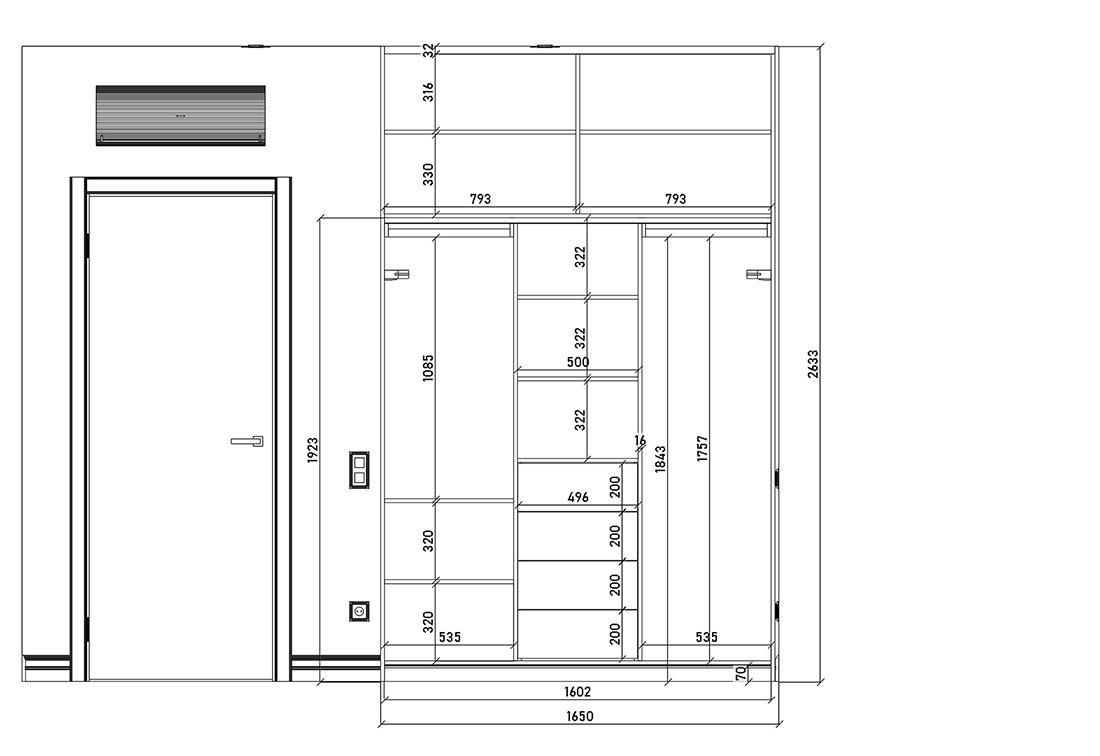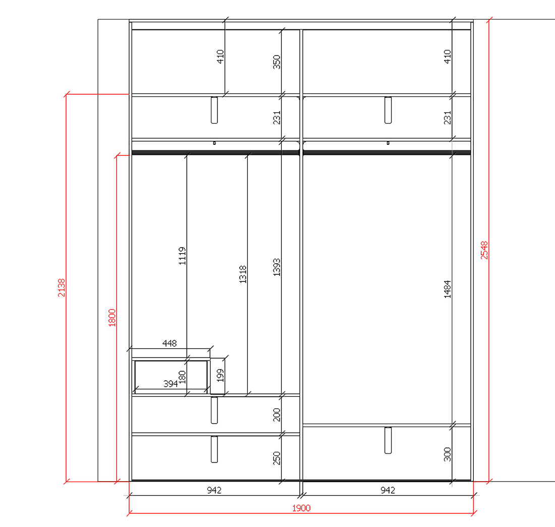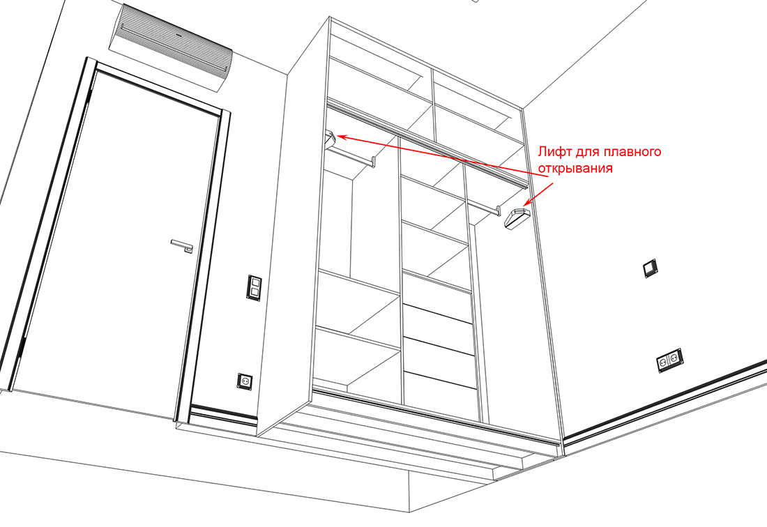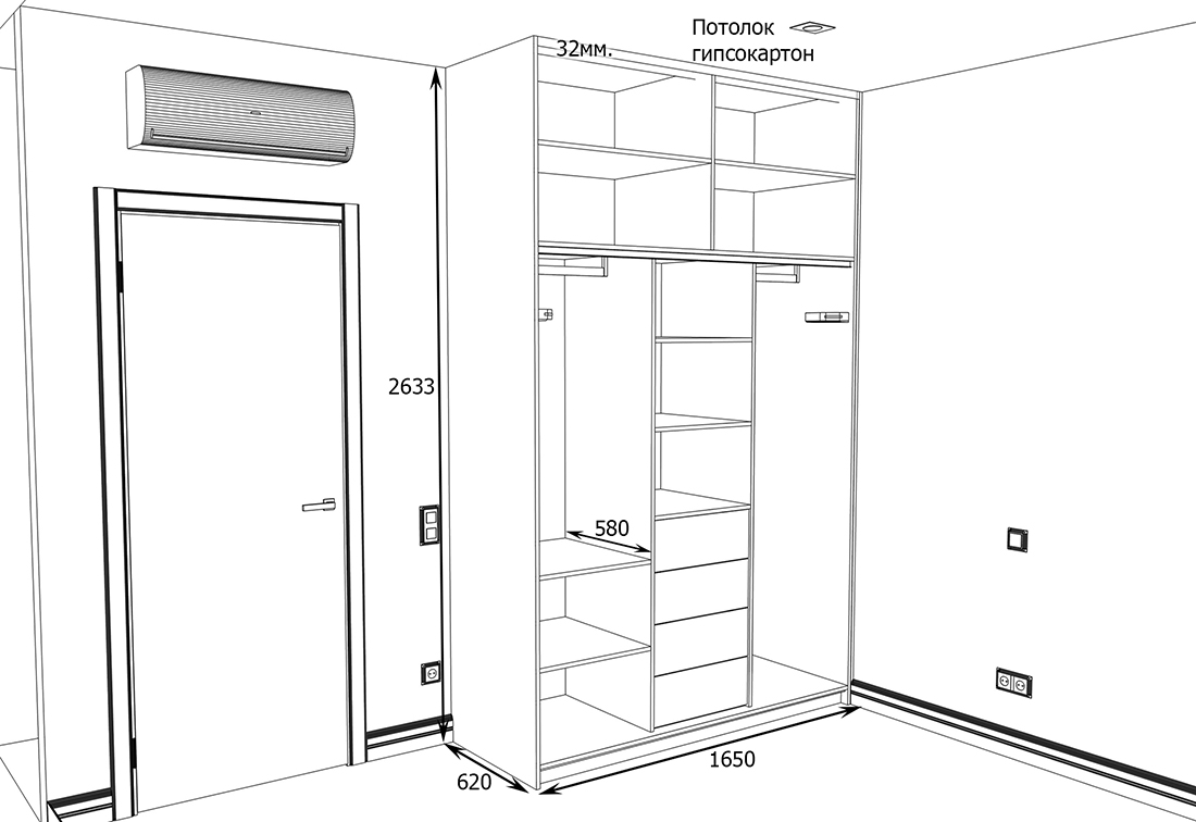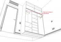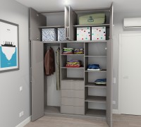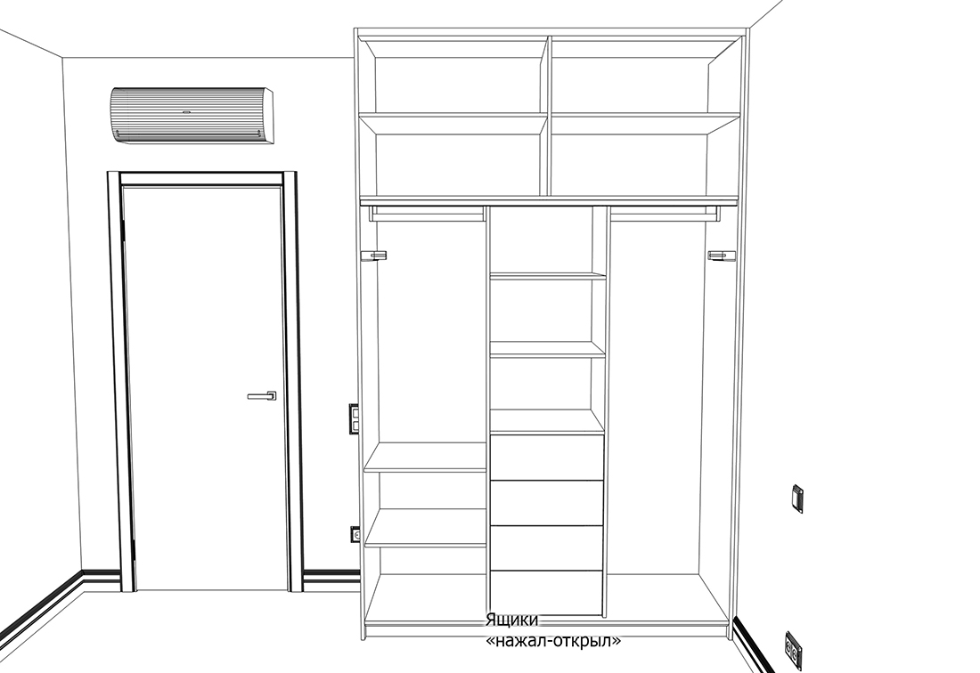 Идеальной мебели не существует, поэтому у данного типа шкафов также есть пара особенностей, которые нужно учитывать. Первый нюанс – это невозможно установить выдвижные ящики вплотную к боковым стенкам. Это обусловлено конструкцией раздвижной системы – створки складываются и перекрывают доступ к полкам с каждого края на 8-15 см, поэтому ящик физически не выдвинется. В случае с открытыми полками или платяным отделением со штангой никаких трудностей нет. Выход из ситуации – установка модуля с выдвижными ящиками по центру. Такое решение не только удобно, но и практично, так как внутреннее пространство делится на три секции (по центру ящики, а по бокам могут быть полки или отделения со штангой), что позволяет удобно хранить различные виды одежды и другие вещи.