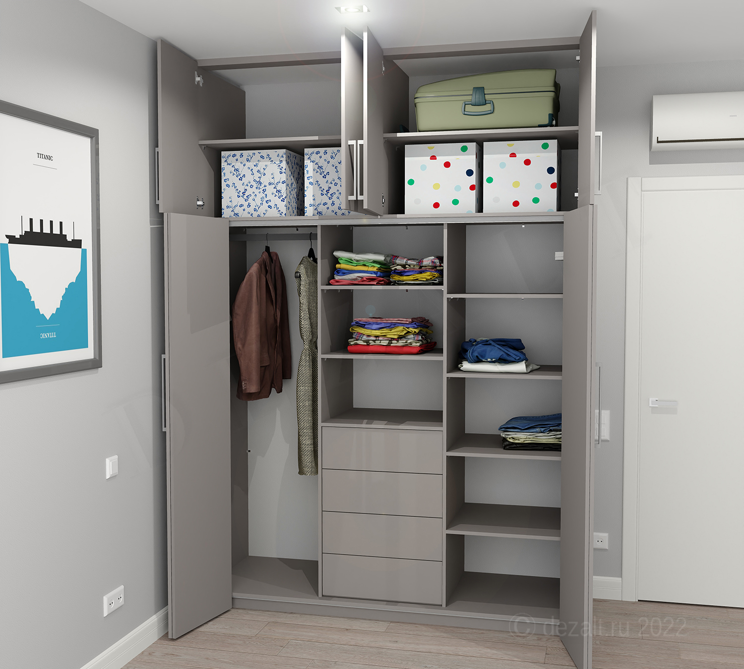 Одно из ключевых преимуществ – это доступ сразу ко всему содержимому отделений. Если взять шкаф купе с двумя дверцами, то одновременно можно открыть или правую или левую сторону, что может быть неудобным при поиске нужных вещей, особенно, если ширина отделения для верхней одежды со штангой будет больше ширины одной створки. Если брать в качестве примера распашной шкаф с аналогичными размерами и двумя фасадами, то там тоже мы получаем полный доступ к содержимому, но открытые створки будут занимать дополнительное пространство в комнате и их не очень удобно обходить. У моделей с «гармошкой» двери также будут выпирать по бокам, но они будут занимать в два раза меньше места благодаря тому, что состоят из двух складывающихся створок.