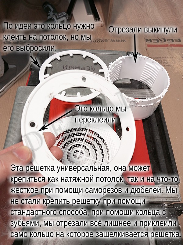Как я понял эта решетка крепится как на жесткую поверхность, так и на натяжной потолок при помощи зубчатого кольца. Мне показалось, что кольцо плохо приклеится из-за своей неровной формы и решил сделать по другому. Я срезал весь лишний пластик реноватором (вибрационная машинка), у меня осталось только колечко к которому крепится декоративная решетка. Колечко я приклеил клеем «96», хотя подойдет практически любой клей, желательно гелевый, чтобы он не растекся и не капал вниз.