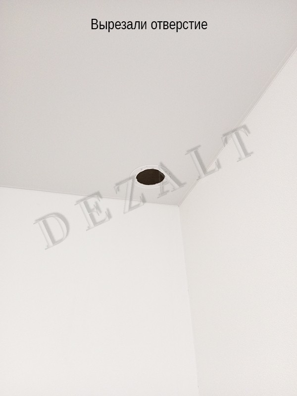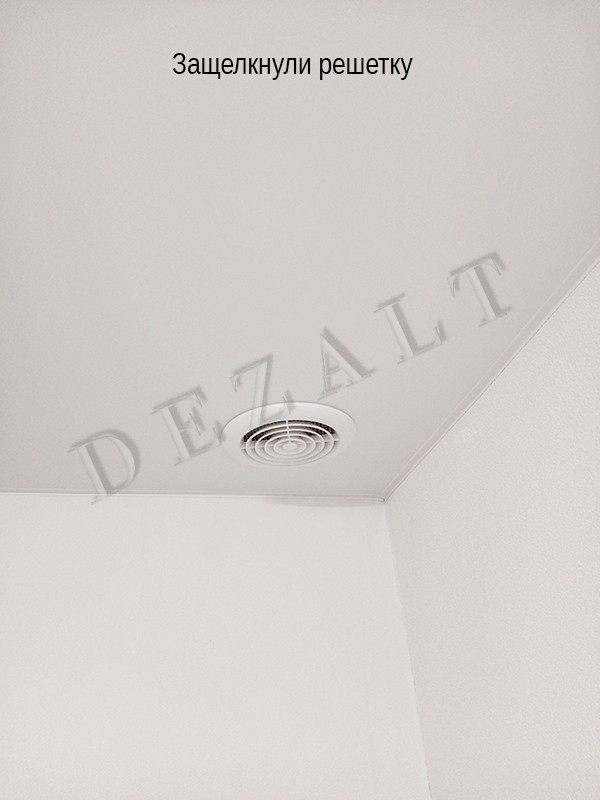 Подождал 1 час, вырезал полотно внутри кольца, надел решетку. Потолок можно сказать на глазах опустился, после того как я сделал надрез. Действительно этот способ помог и хватило одного отверстия в нашем случае.