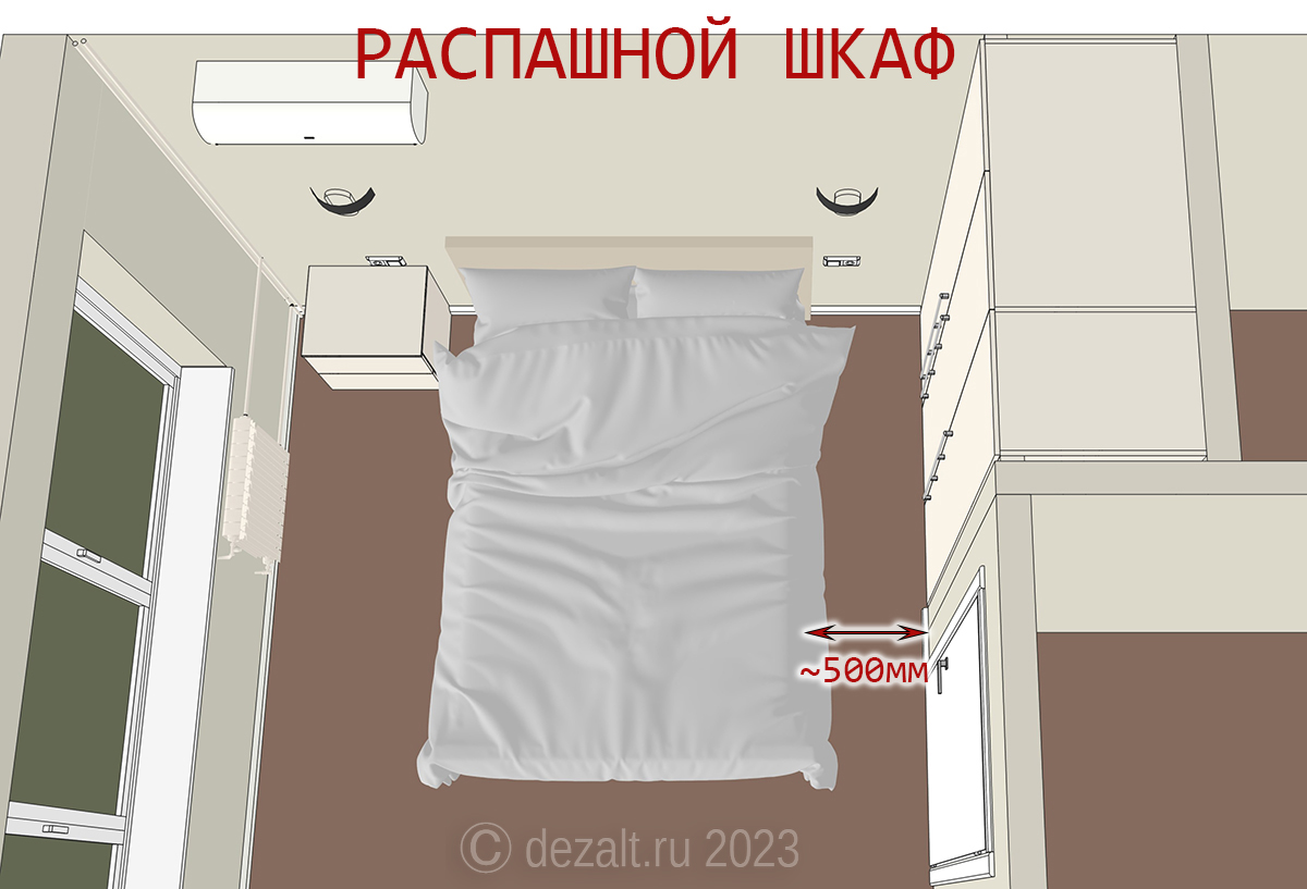 Обычно в спальне мало места из-за кровати, особенно тесно становится когда есть прикроватные тумбочки.
