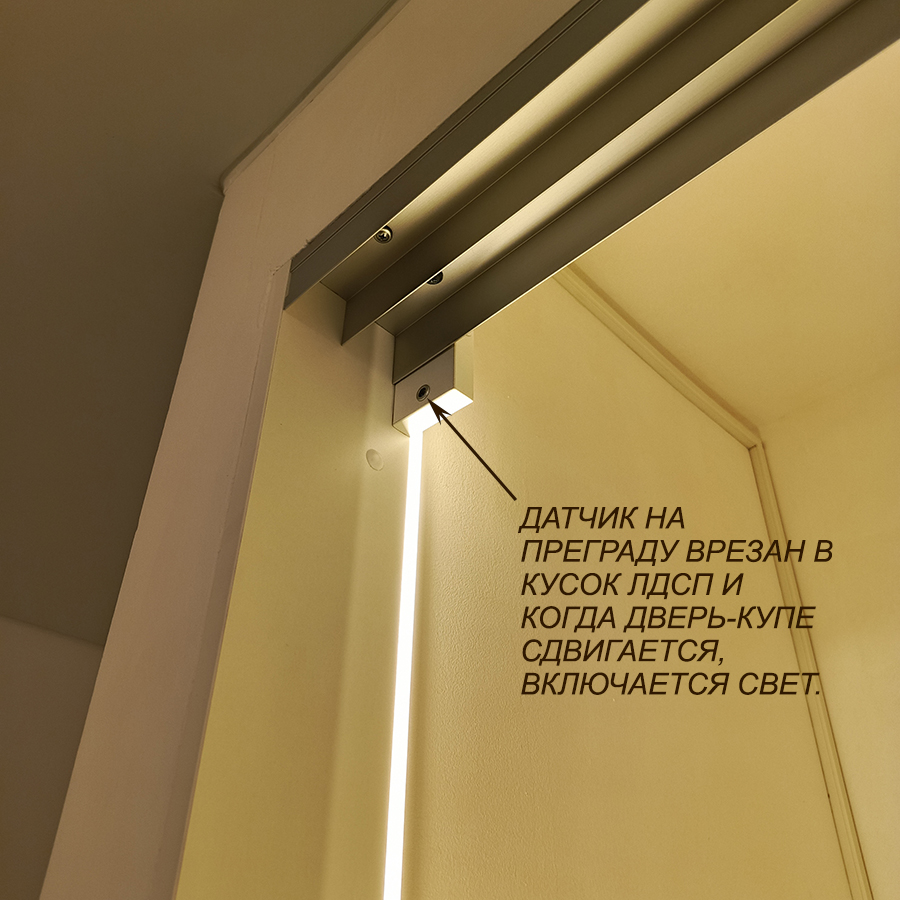 Вот тут, уже стоят датчики на преграду и когда дверь открывается, плавно включается светодиодная лента относящаяся к этой двери.