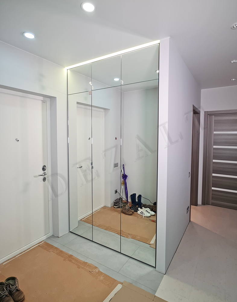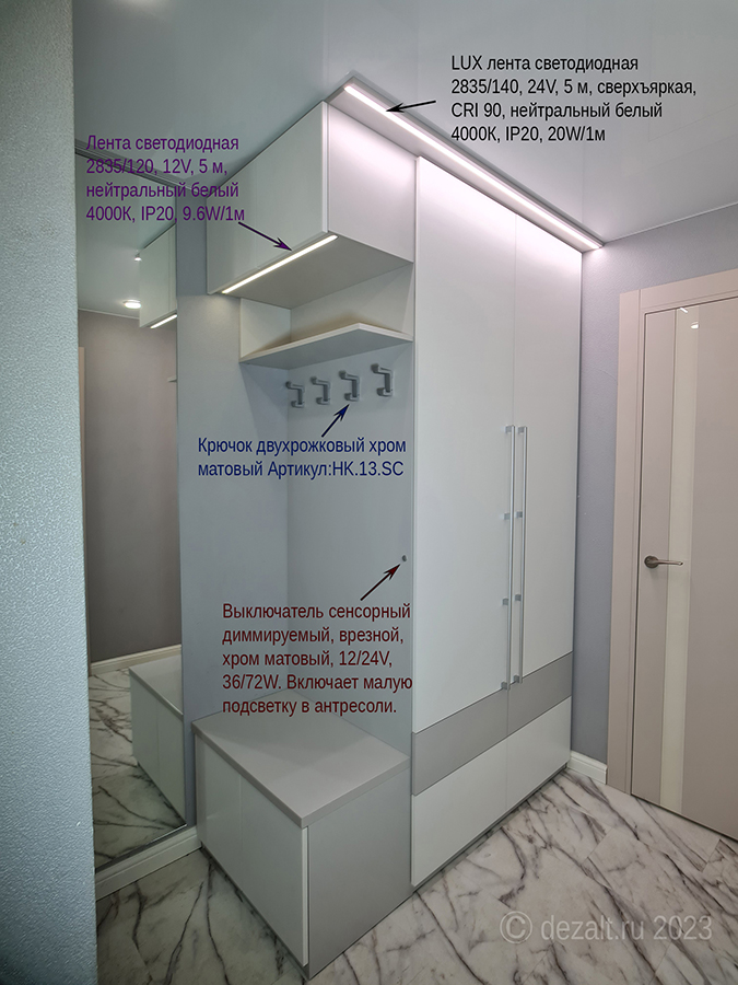 Приведу отличный пример по фотографии. Мы сделали шкаф в прихожую, у которого на большом козырьке установлена мощная двадцативатная лента, заменяющая два точечных светильника, а снизу под антресолью декоративная лента в 10 ватт.