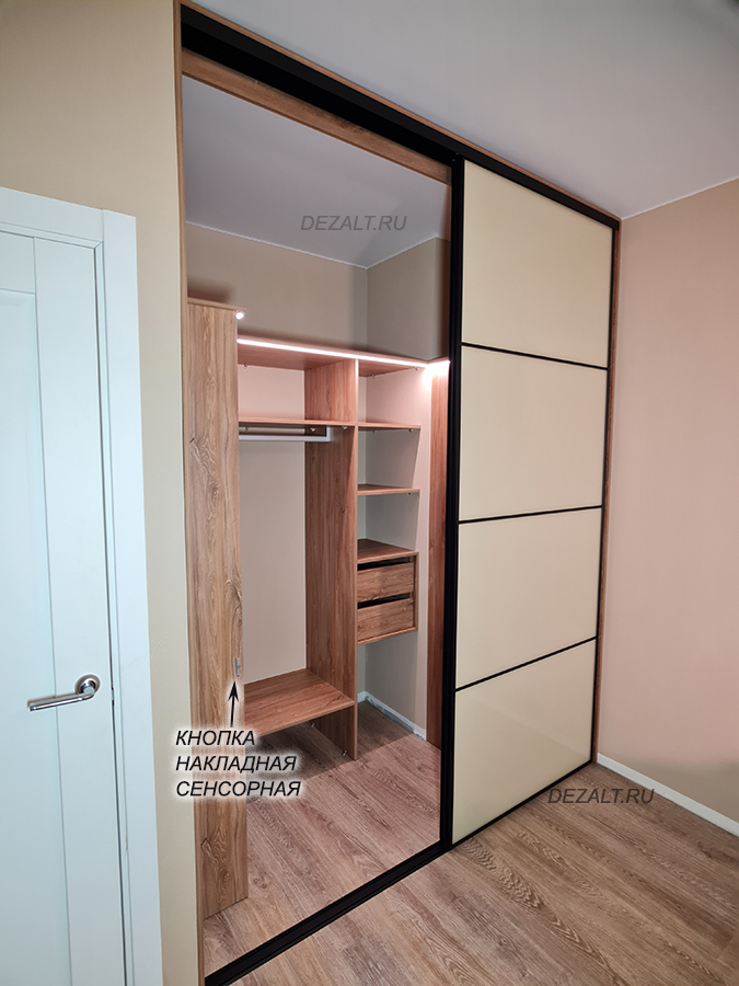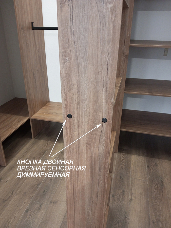 Когда вам нужно, чтобы свет включался при раскрытии двери шкафа, мы ставим выключатель с датчиком на преграду. Вы открываете дверь, датчик не видит препятствия и включает свет. Это очень удобно для каждодневного пользования шкафом.