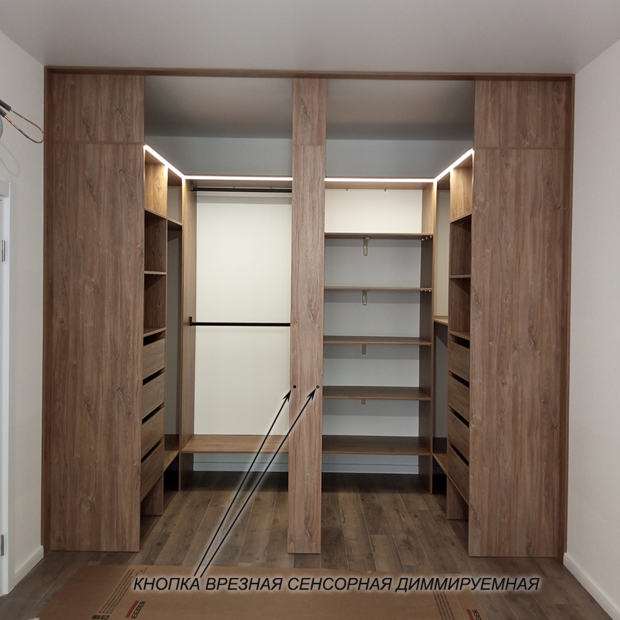 Включение в гардеробных лучше делать от выключателей, не используя никакие датчики, это моё личное мнение. Дело в том, что когда вы входите в гардеробную, иногда есть необходимость закрыться в ней. Если у вас будут стоять датчики на преграду, они срабатывают от закрытых дверей и свет будет гаснуть. Тоже самое происходит с датчиками на движение. Периодически свет будет выключаться, а затем снова включаться. Это очень раздражает. Практичней пользоваться выключателем.