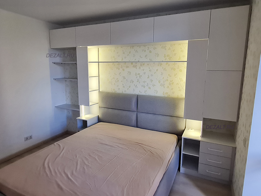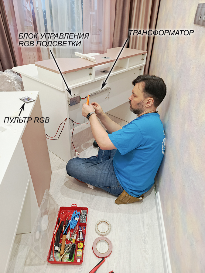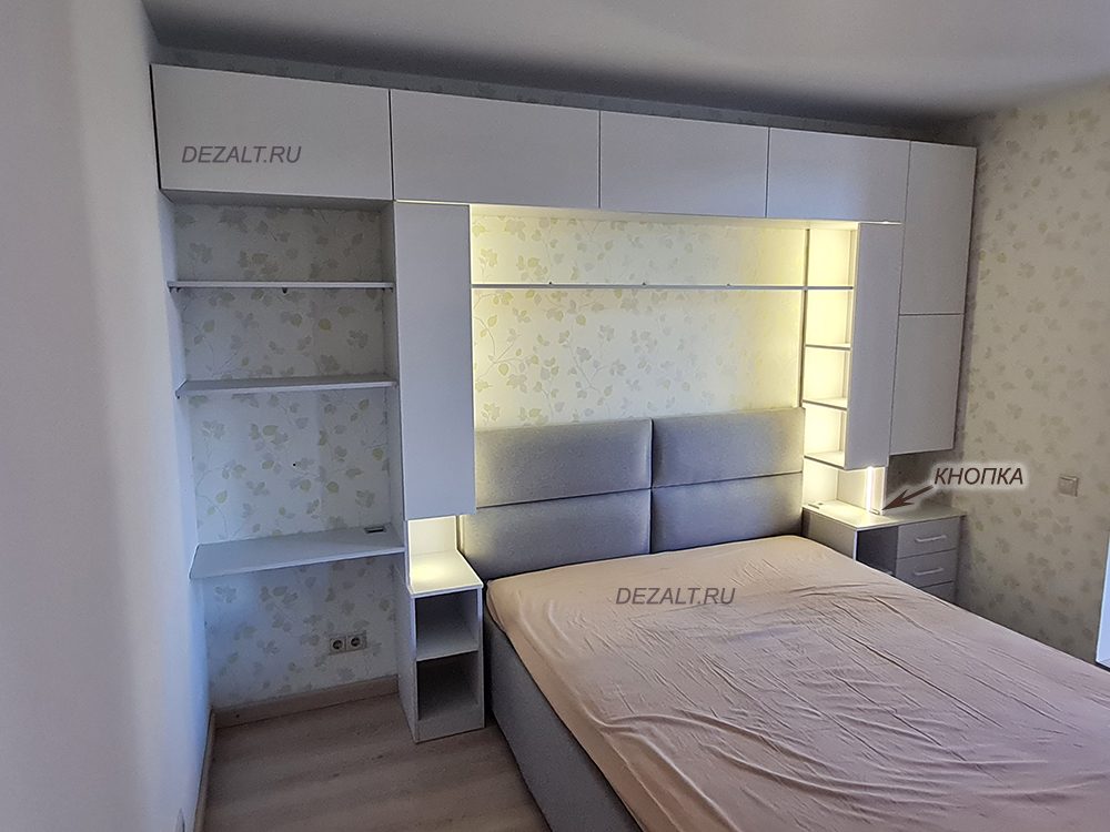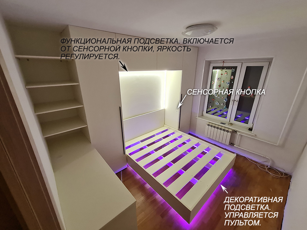 Посмотрите на пример, когда в изголовье включается светодиодная подсветка для чтения с функцией регулировки яркости от сенсорной кнопки. А под кроватью, мы сделали цветную (RGB) подсветку, работающую от пульта.