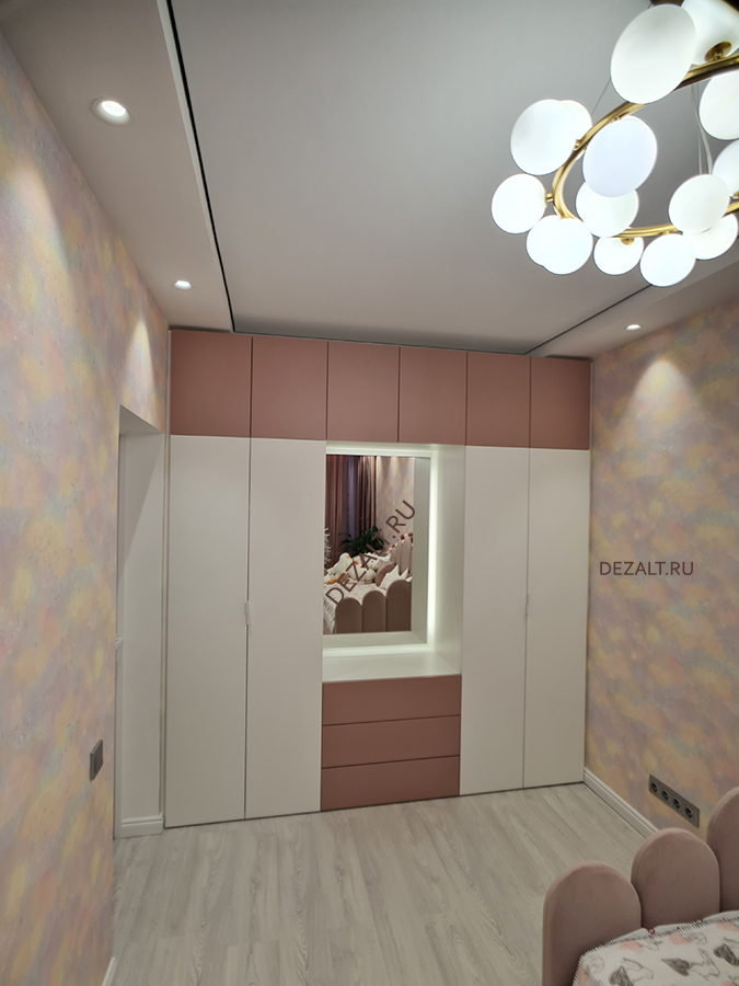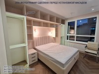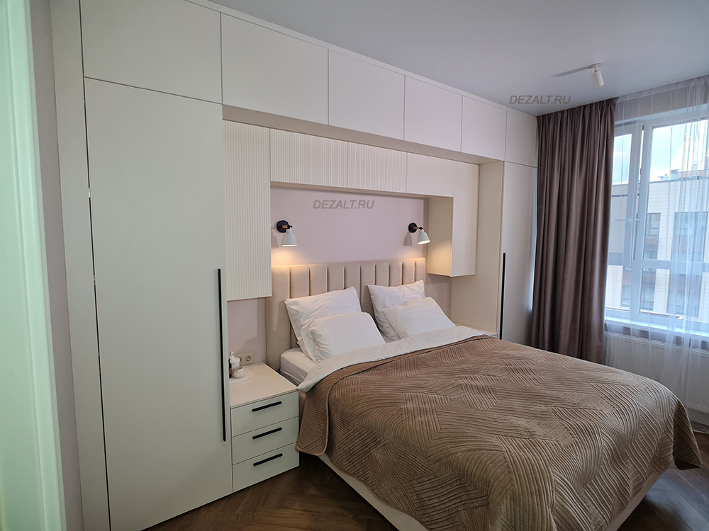 Приведу пример, когда свет для чтения в изголовье над кроватью мы сделали при помощи бра, а внутри больших шкафов использовали светодиодную вертикальную подсветку.