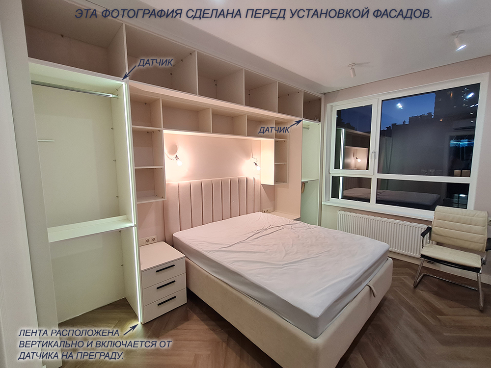 Бра включаются от настенного выключателя, а ленты от датчика на преграду. Когда открываешь дверь шкафа, включается свет.