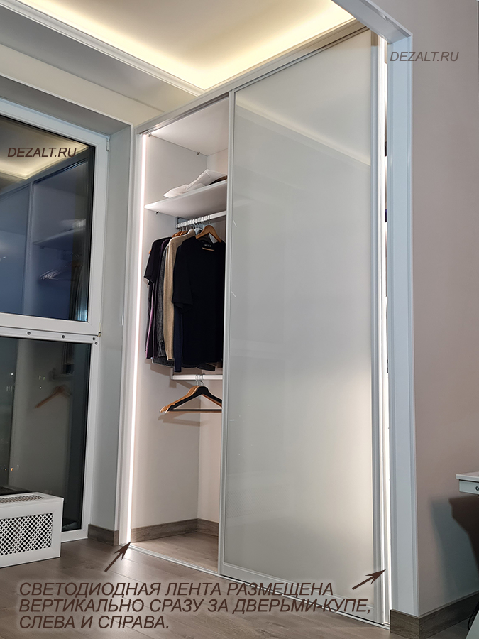 Это классический вариант, когда при открывании двери зажигается свет внутри шкафа. Желательно ленту располагать ближе к фасадной част и вертикально, через все полки. Тогда свет начнет попадать с вашей стороны на каждую полку и всё будет прекрасно видно.