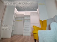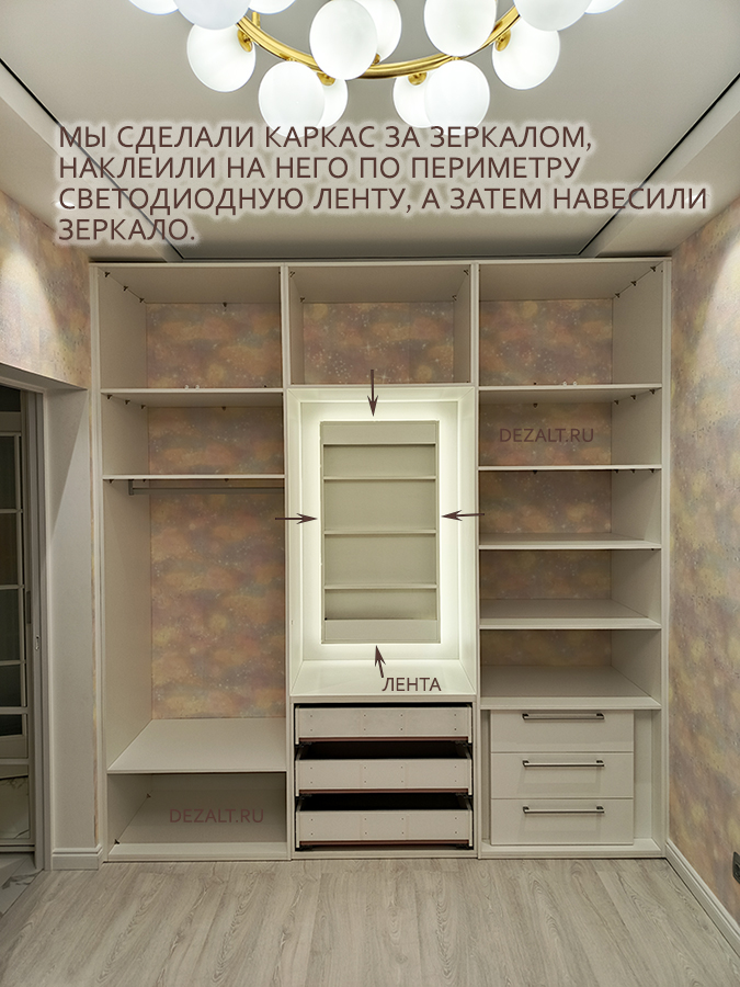 Самое простое решение для гардеробных, это немного выдвинуть верхние полки в центр и прикрепить к получившемуся козырьку светодиодную ленту.