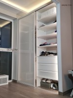 В гардеробных очень часто нехватает света. Даже если вы его предусмотрели, то верхние антресольные полки, как правило, съедают свет потолочных светильников, дают мощную тень на полки.