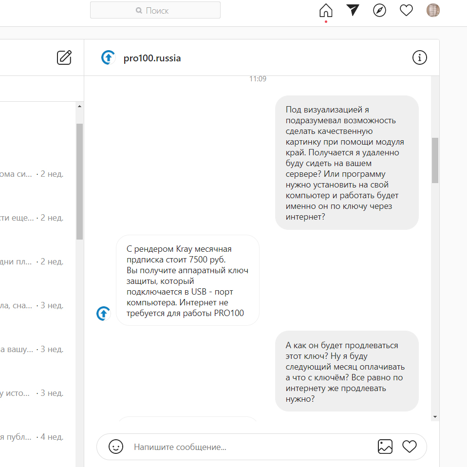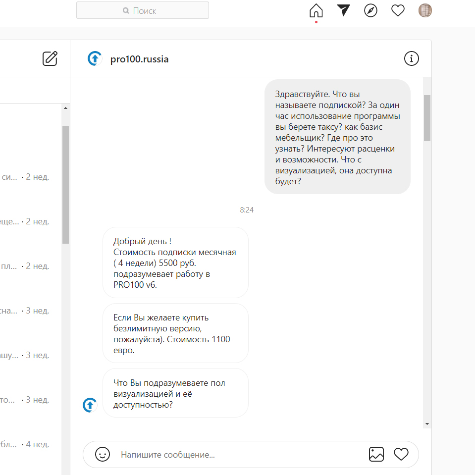 Наткнулся на пост в инстаграм, заинтересовался, знаю такую программу, рисую в старой версии мебель. Написал сообщение продавцу, расспросил об условиях.
