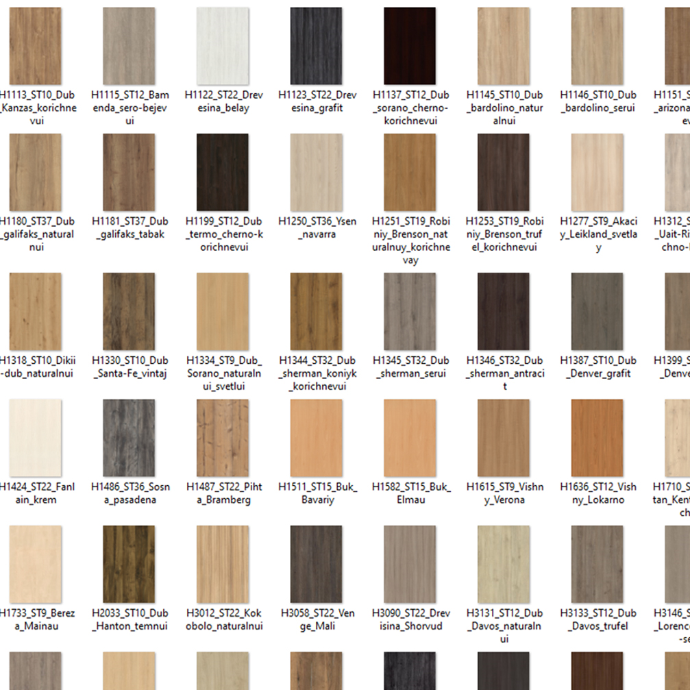 Так как времени сейчас из-за пандемии полно, занялся этим вопросом. Скачал каждый декор по отдельности с сайта производителя, перекодировал его в jpg формат, подписал правильным артикулом и разложил в две папки. В одной у меня однотонные, во второй древесные. За основу я взял печатный каталог Эггера, тот что мы покупаем у дилеров от 1500 до 4000 тысяч.