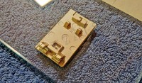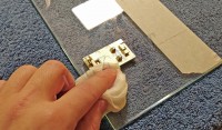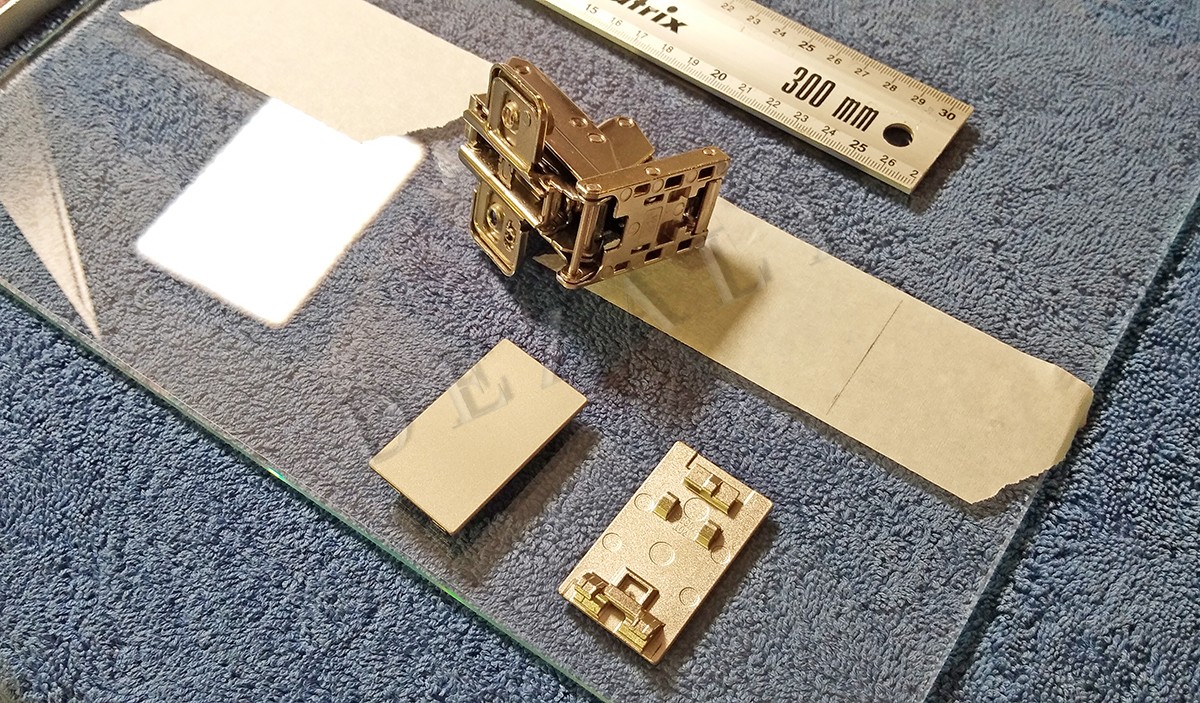 Обезжирили поверхность спиртом. Нанесли клей на саму металлическую площадку, разровняли клей зубочисткой, перевернули и приложили её на стекло. Клей вытек со всех сторон, площадка начала смещаться под собственным весом, как бы потихоньку скользить. Это нам и доставляло основное неудобства. Повторюсь, шаблона нет, площадка плавает из стороны в сторону и если её не зафиксировать, то приклеится неровно. Тогда нужно будет покупать площадки для петель и заказывать новые дверки из стекла.
