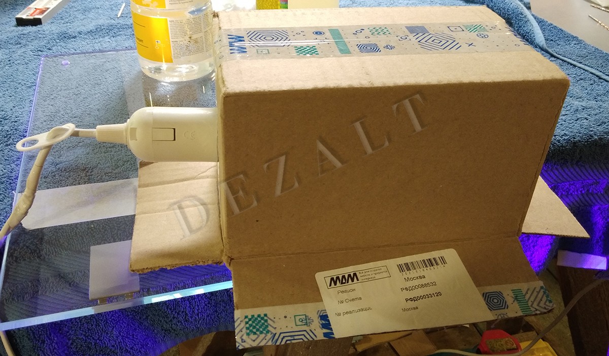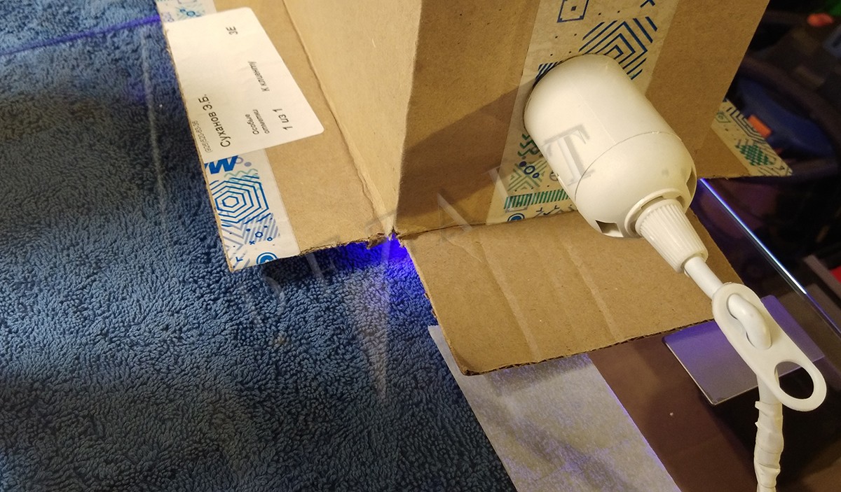 Нам пришлось купить специальную лампу, которая светит ультрафиолетовыми лучами, её цена примерно 500р. на сегодняшний день. Помните, этот свет очень губителен для глаз и кожи, нельзя находиться под её светом.