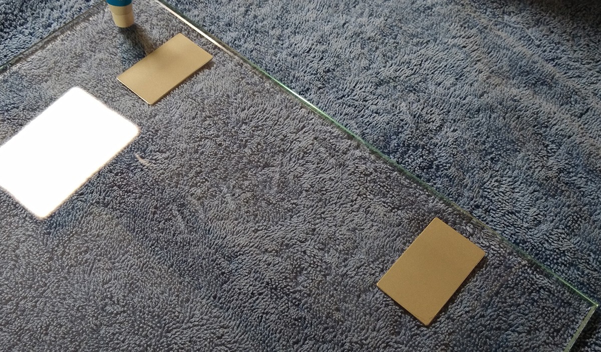 Ну и еще один нюанс. Очень сильно давить на площадку не нужно, иначе вытечет весь клей и образуются пустоты, их видно через стекло. Делайте все не спеша, прижмите, посмотрите через стекло как всё выглядит. Если видите что всё в пятнах, лучше снимите площадку, смойте клей со стекла и начните заново. Если вы сразу приложите УФ-лампу, переделать уже не получится. Желаю удачи.