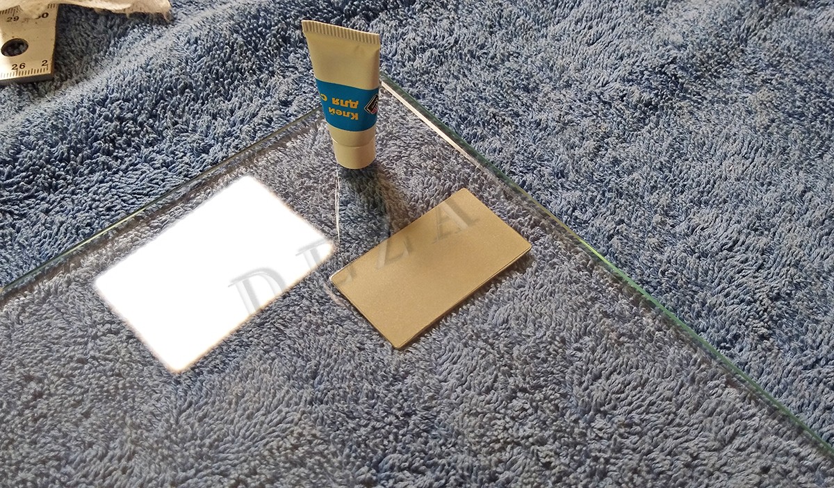 Купили специальный клей, который затвердевает от ультрафиолетовых лучей, главное не перепутать. Есть клей для стекло+стекло, а есть клей для металл+стекло. Нам нужен металл + стекло.
