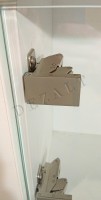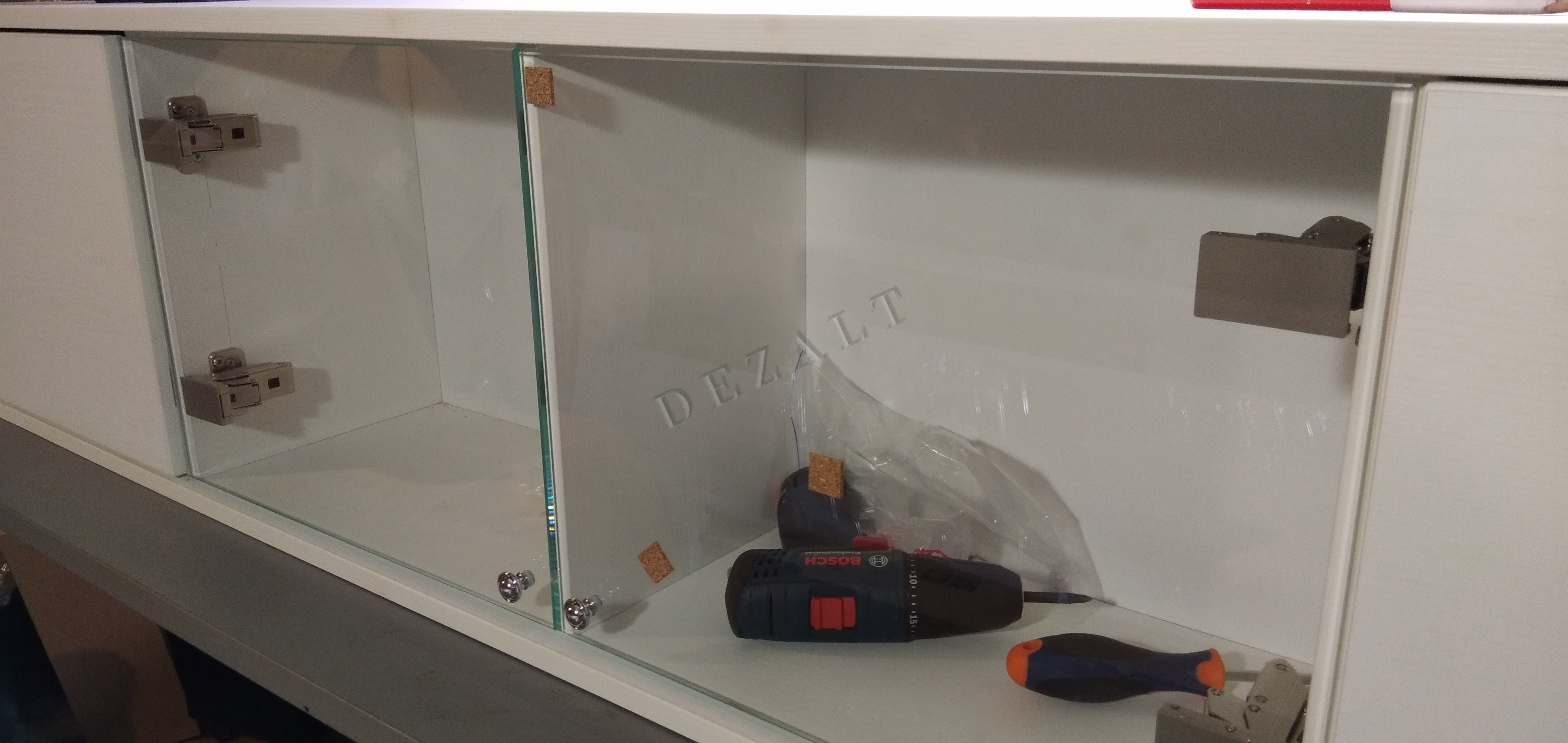 Через несколько суток мы взяли наши дверки из стекла оптивайт, площадки уже приклеились намертво. Прищелкнули к ним петли и установили на настенную полочку.