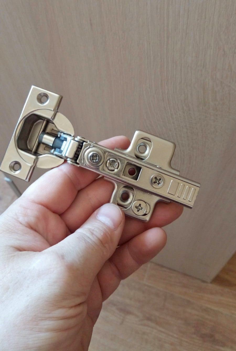 Коллега из Йошкар-Олы прислал фото петли очень напоминающую петлю «Блюм». Рассказал что ему предложили эти петли по 90 рублей как замена петлям «Блюм». На вид крепкие, но рисковать он пока не готов, если только ради эксперимента купить парочку, поставить на дверце в цеху, посмотреть сколько они выдержит.
