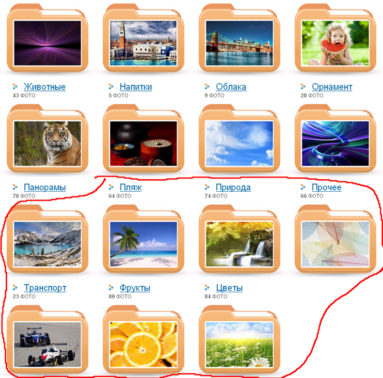 Пляж - 64 шт. Природа - 74 шт. Прочее - 66 шт. Транспорт - 23 шт. Фрукты - 80 шт. Цветы - 84 шт.