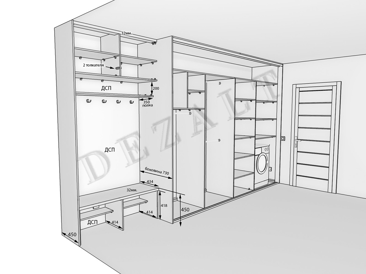Как вы видите из чертежей, рядом со шкафом-купе расположилась открытая секция, для верхней одежды, это частое решение в прихожих комнатах. У людей бытует два разнополярных мнения.