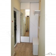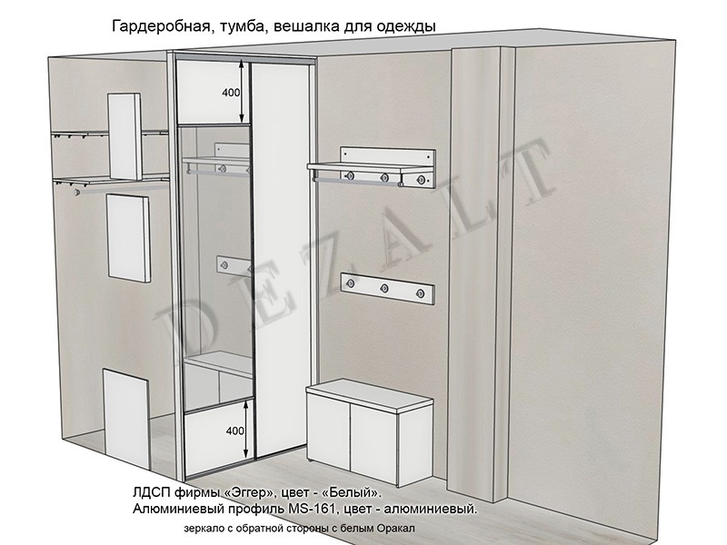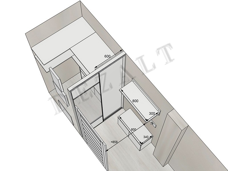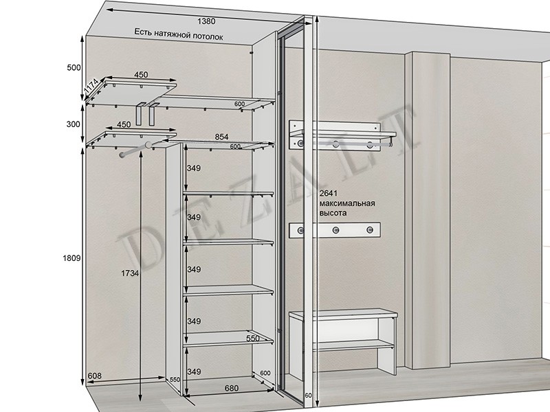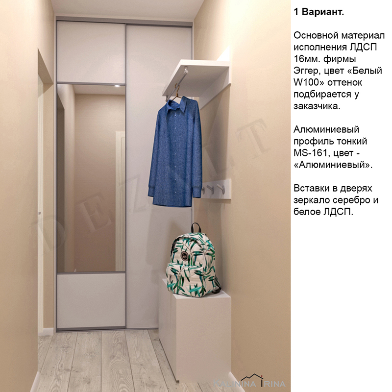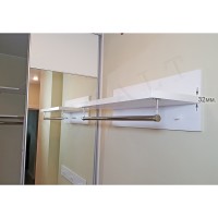 Перед входом в гардеробную остается совсем небольшой пяточек, на котором целесообразно разместить что-то для верхней одежды, открытую вешалку. Мы предложили установить крючки и полочку для шапок, внизу тумбу, но клиент внес небольшие коррективы. По его просьбе, мы добавили штангу на верхнюю полку. Мы сразу предупредили, что верхняя полка хоть и будет сделана из толстого ЛДСП в 32мм. большую нагрузку не выдержит и отвалится. Клиент успокоил, обещал что на штангу будет вешать одежду для сушки, затем перемещать ее на крючок, либо в гардеробную.