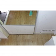 Потолок в помещении натяжной, закладная (брус под натяжным потолком) отсутствовала и нужно было подумать как закрепить верхний трек для дверей-купе. Тогда мы сделали слева сдвижную дверь, которая служит входом, а справа установили заглушку из ЛДСП. Вот эта заглушка и послужила опорой верхней планки, к которой закрепили верхний трек.