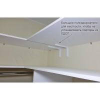 Очень часто, нас просят делать большую сплошную антресольную полку. Действительно это удобно! Можно накладывать на нее разные чемоданы, коробки с вещами, походные принадлежности, все то, чем мы пользуемся редко. Отсутствие вертикальных перемычек облегчает перемещение этих вещей на полке. Можно свободно передвигать предметы из стороны в сторону.