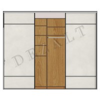 У нас был простенок длиной 3172мм. и высотой 2637мм. нужно было закрыть его дверьми-купе. Шкафы, как вы уже поняли стояли, необходимо их спрятать. Мы не поленились, сняли размеры секций, изобразили шкафы в программе, добавили двери и показали клиенту, что будут перекрывать двери при сдвижении. Как понятно из чертежей, ничего критического не произойдет, в любую секцию есть доступ и даже сетчатые ящики будут свободно выдвигаться. На этом и остановились.