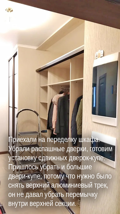 Позже мы привезли компактные двери-купе и установили их вместо распашных дверок. Смотрите в самом низу что получилось. Замена верхних дверей обошлось клиенту в 15000 рублей.