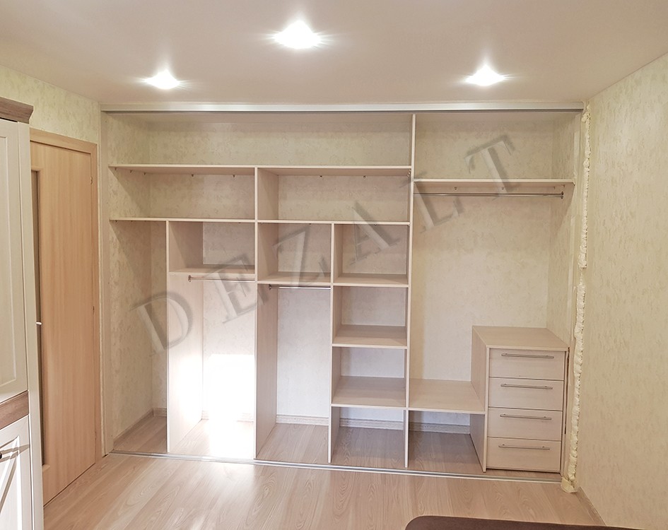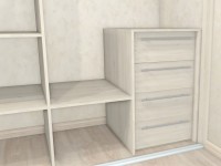 По наполнению шкаф не сложный. В нем есть 3 штанги, 6 квадратных полок, две широкие полки и большие антресольные полки. Уместили в конструкцию 4 выдвижных ящика и нишу для хозяйственных нужд. Всё самое необходимое есть. Шкаф очень глубокий — 800мм.