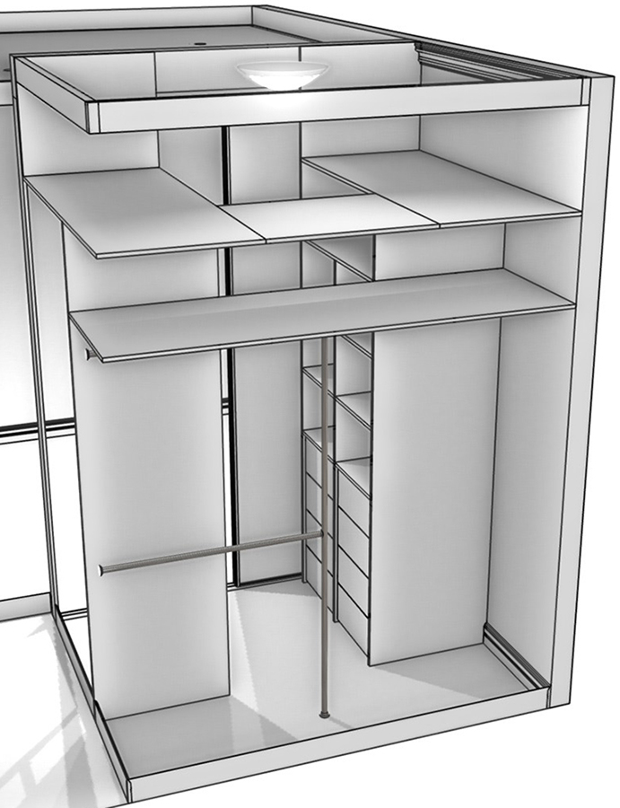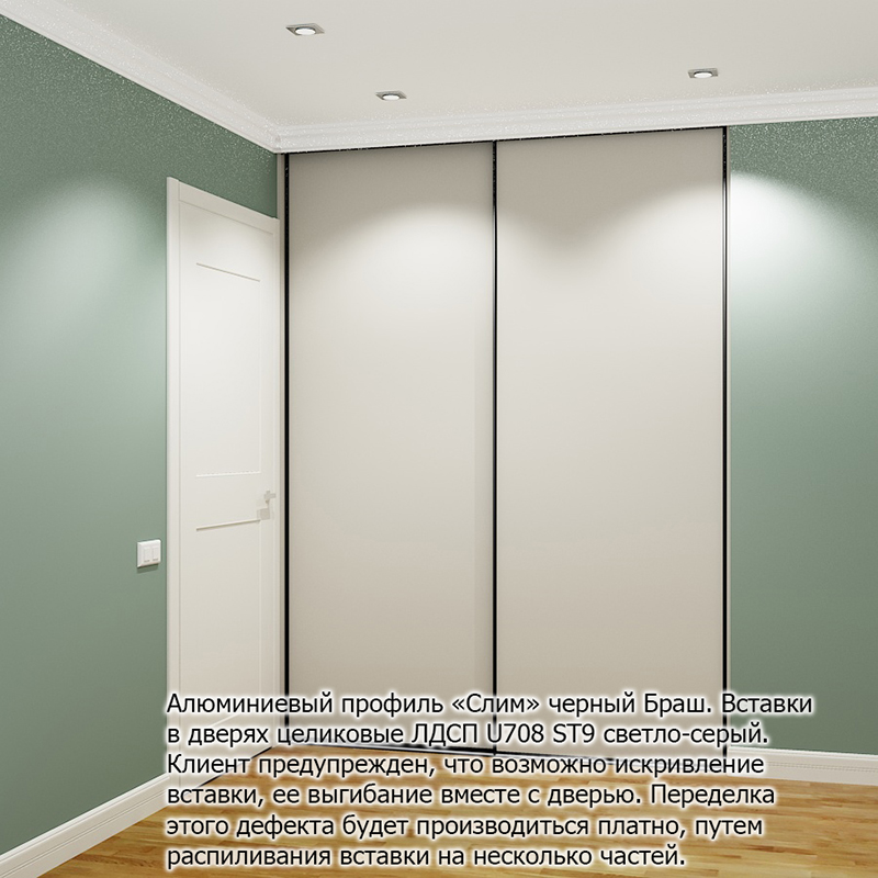 Мы сделали серые внутренности и вставки в дверях из ЛДСП «Светло-серый U780 ST09». Единственный важный момент, который нам пришлось обсуждать с клиентом, это целиковые вставки в дверях. Нужно избегать больших целиковых вставок в дверях из ЛДСП и МДФ. Редкий раз, вставку может выгнуть из-за влажности в помещении, тогда двери начнут биться друг о друга, они станут дугой. Подробней о такой ситуации, вы можете прочитать в нашей статье — Что делать, если выгнуло дверь-купе?