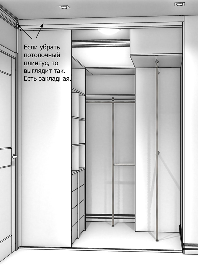 Сверху большая П-образная антресольная полка. Всегда просят сделать широкую полку на самом верху, для вещей, которыми редко пользуются. Туда можно положить туристическое снаряжение, елку, лыжи на хранение, чемоданы для путешествия, коробки с обувью, ну всё что берем в руки по случаю.