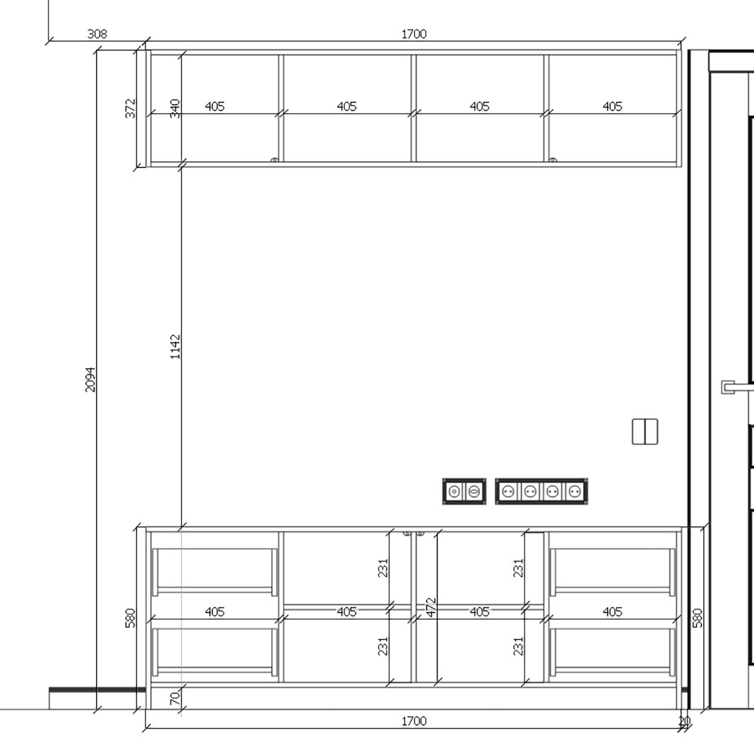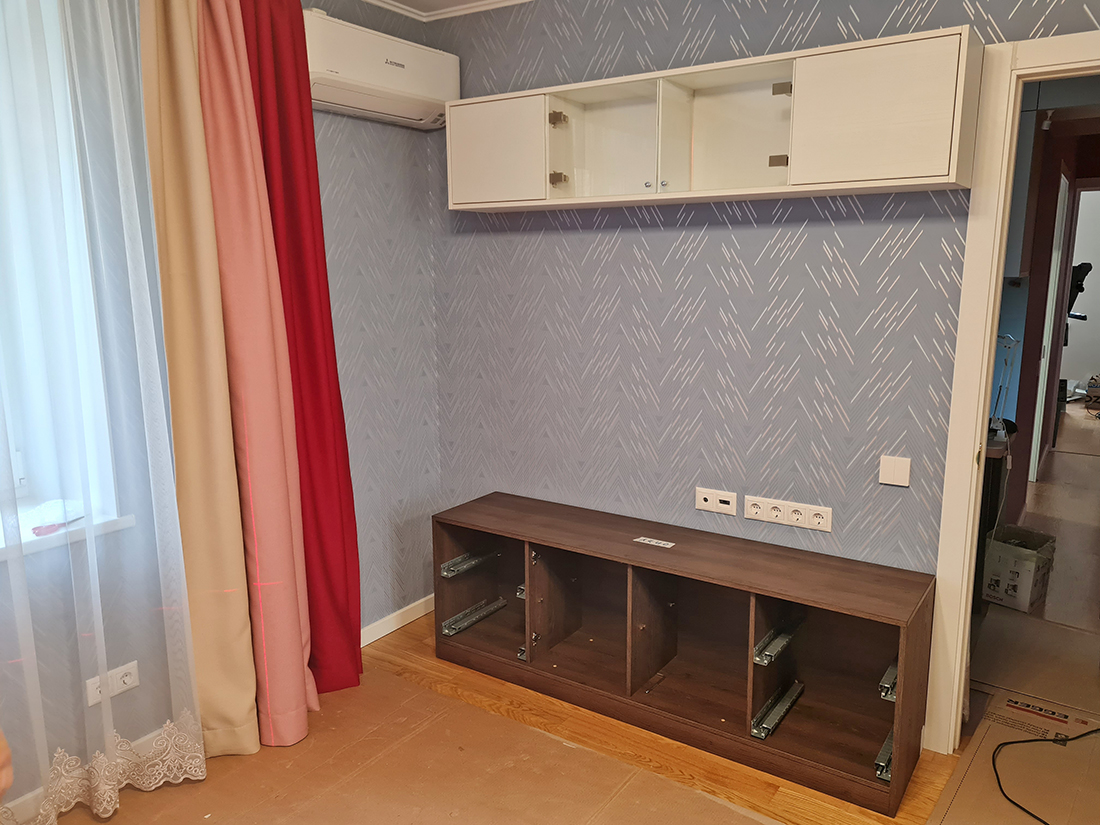 Шкаф-купе мы благополучно закончили, сдали его и не смотря на неприятный инцидент с проводом, Евгений заказал нам мини-стеночку в эту же комнату. Я снова поработал над чертежами в программе и с третьего раза у нас получилось следующее.