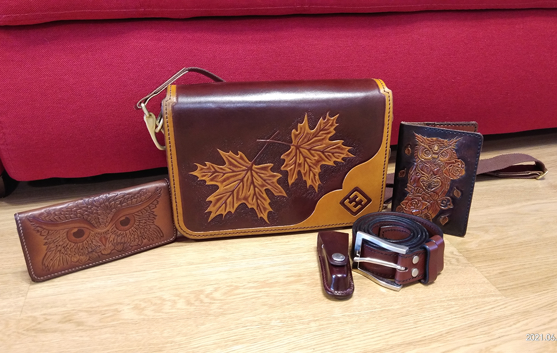 У заказчика есть интересное хобби, он делает изделия из кожи. Посмотрите на несколько работ которые мы сфотографировали у него дома.