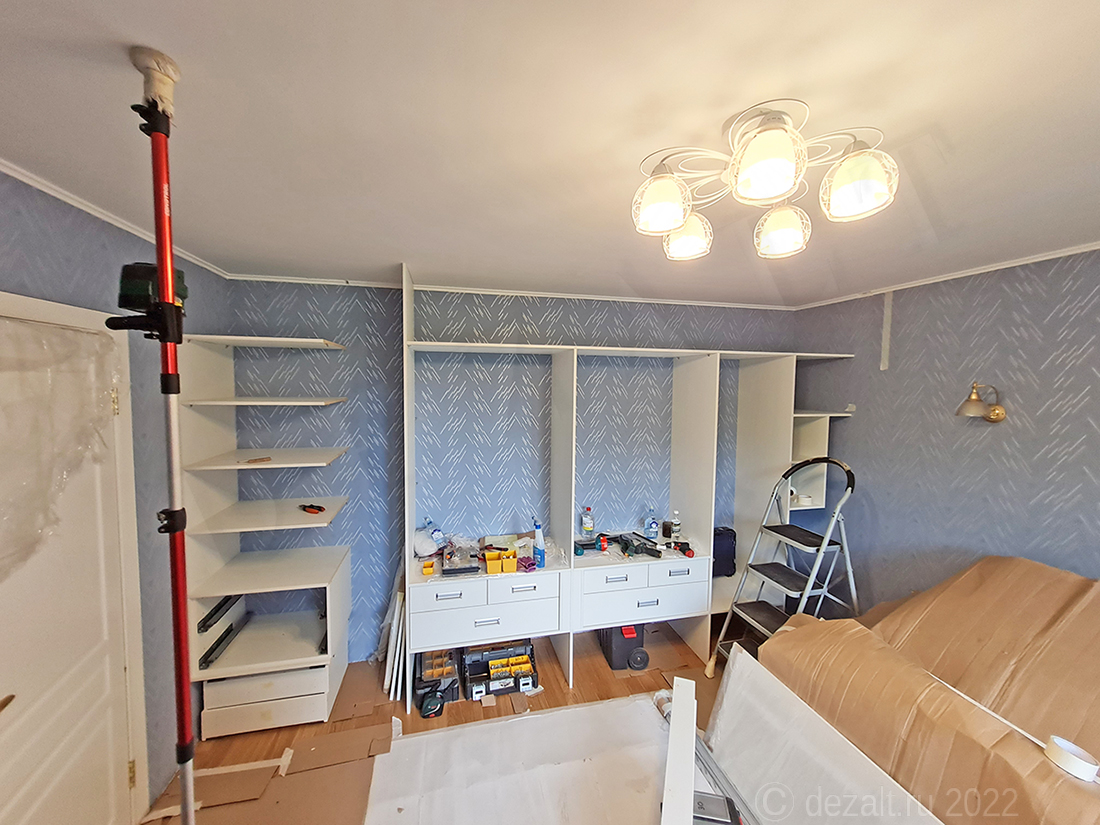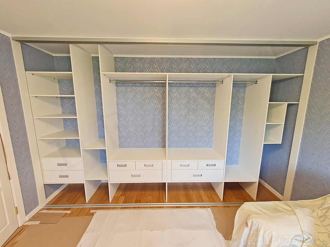Вместе с чертежами, я сообщил стоимость на шкаф со сборкой, клиента устроила цена. Сначала был составлен договор в электронном виде, затем мы встретились у Евгения дома. Я сделал все необходимые замеры, обсудили цвета материалов и некоторые технические особенности. Например мы договорились об установке доводчиков на боковые двери и что все 8 ящиков будут на невидимых выдвижных механизмах.