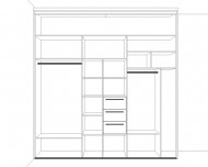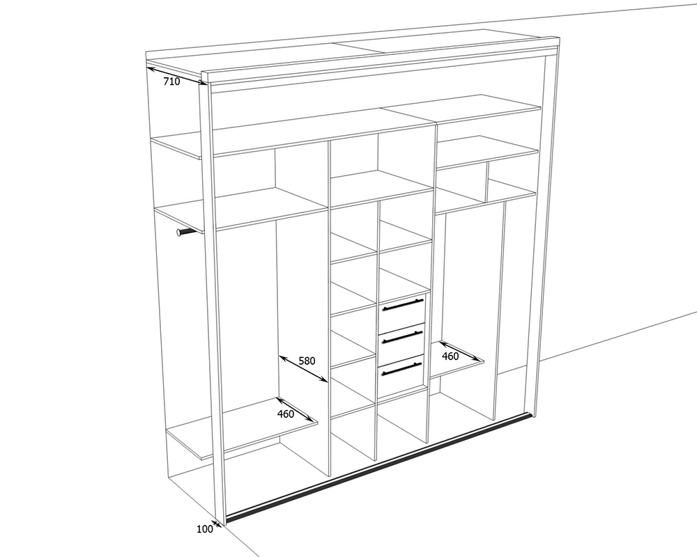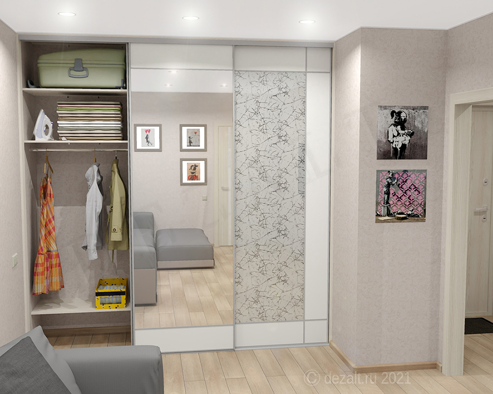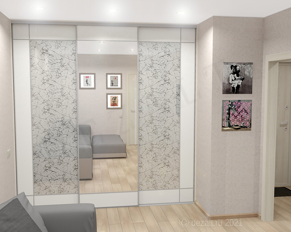По внешнему виду Александр попросил сделать что-то с зеркалом, но так, чтобы его было минимум, буквально для расширения пространства. Первый вариант мы сделали с зеркалом «УАДИ». Смотрите ниже чертежи шкафа и первый вариант дверей-купе, который мы сделали.