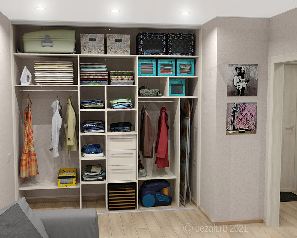 Мы постарались всё предусмотреть и исполнить. Расположение полок, штанг и ящиков полностью устроило заказчик, единственно, он попросил сделать ящики с ручками, вместо функции «нажал-открыл».