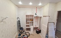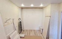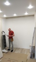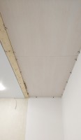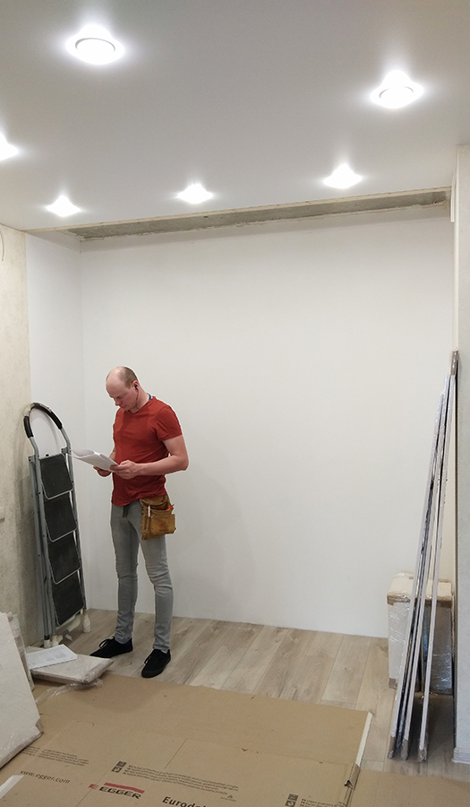 В комнате уже был натянут потолок, а в том месте где нужно возвести шкаф виднелся бетонный потолок с открытой закладной. По задумке, мы должны были спрятать бетон ламинированным плитами, а к закладной закрепить верхний трек для дверей.