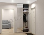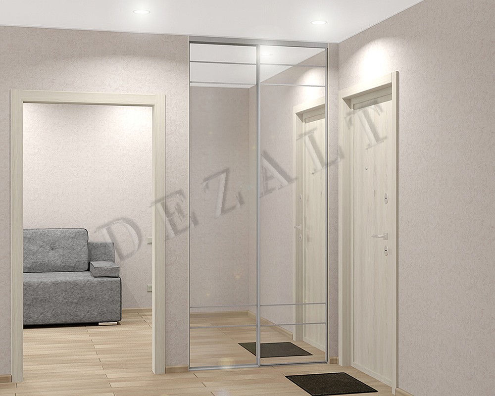 Так как речь идет о прихожей, логично сделать двери-купе зеркальными, но просто два целиковых зеркала клиент не захотел и мы попробовали предложить разные варианты.