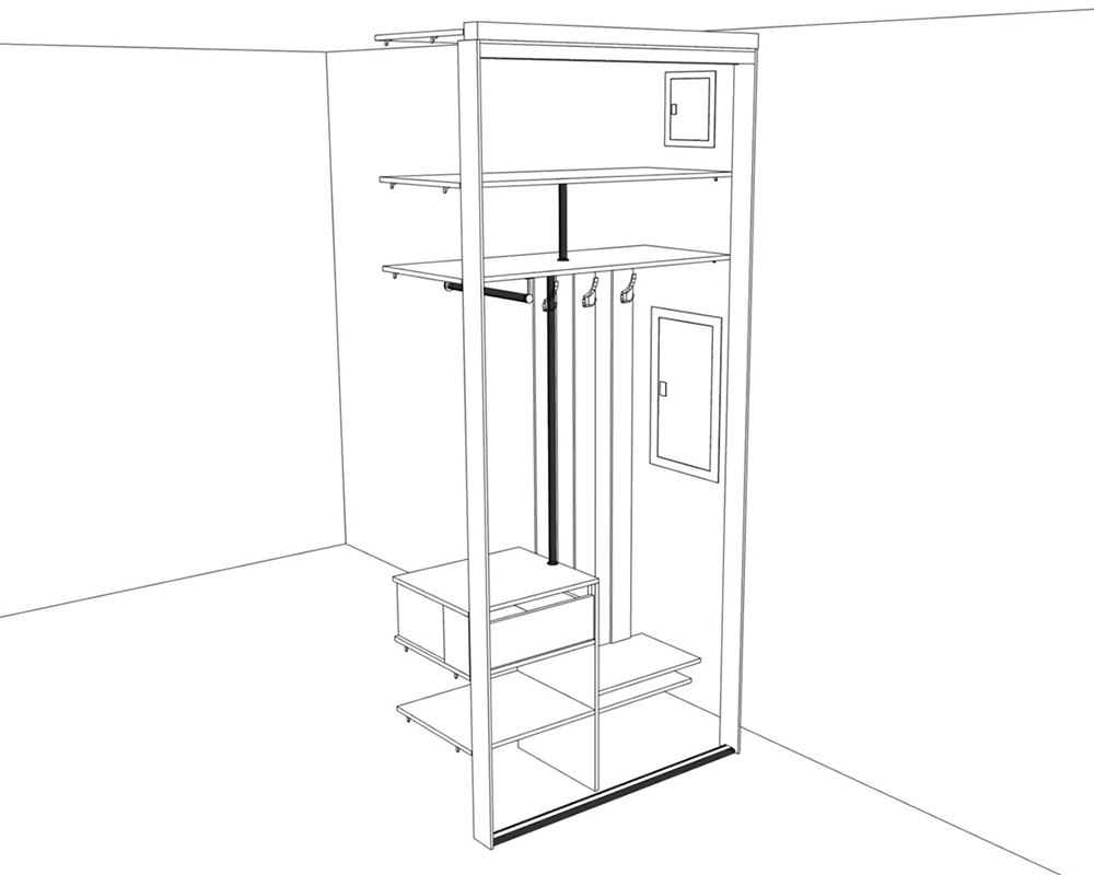 В прихожей была предусмотрена ниша, но совсем небольшая. Её глубина 570мм., этого недостаточно для полноценного шкафа-купе с продольной штангой. Двери забирают 100мм. от глубины, значит остается 470мм., плечики поместятся с трудом, а рукава одежды будут мешать закрыванию дверей. Поэтому нам пришлось в левой части шкафа установить штангу фронтально, а в правой части поставили только крючки.