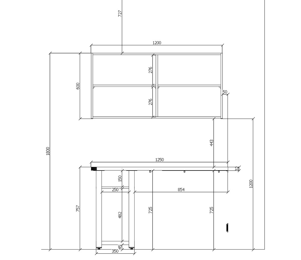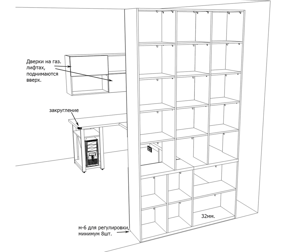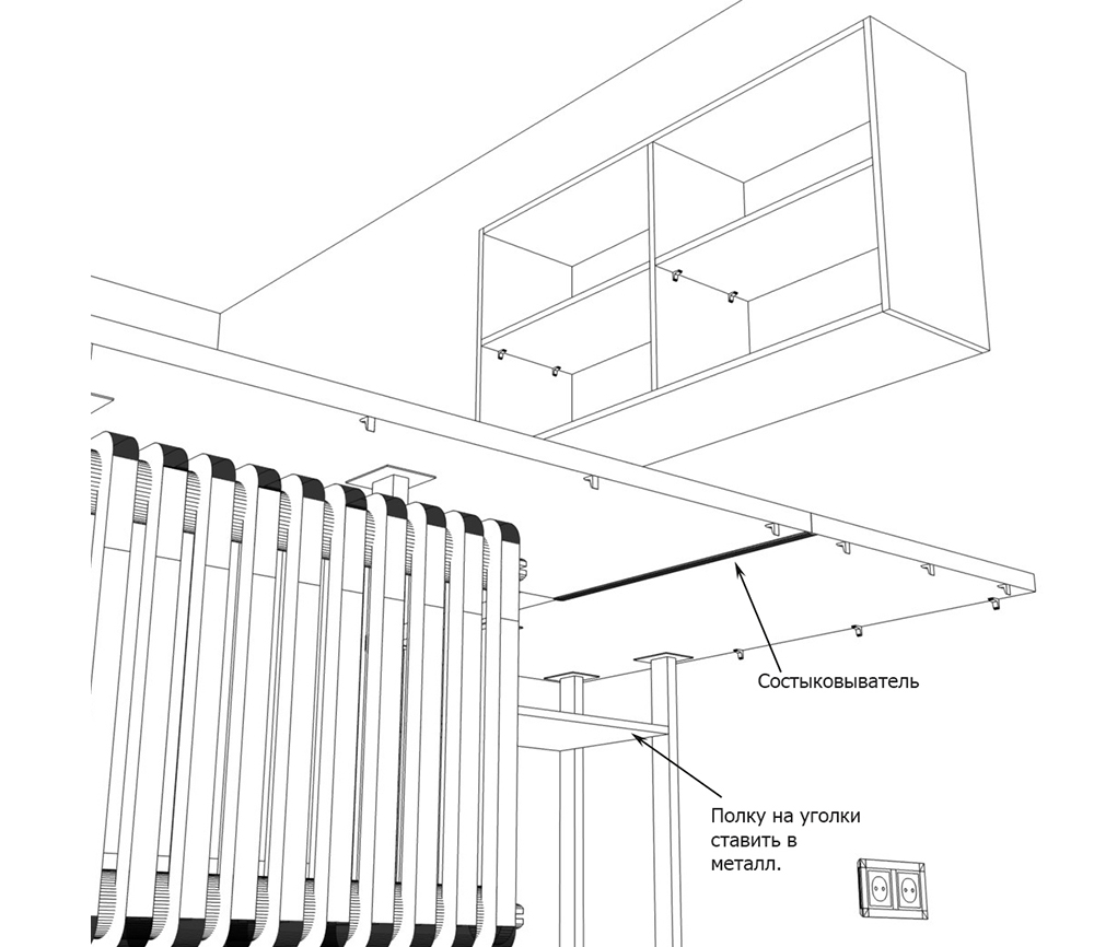 Под длинным столом убрал полки и оставил только одну металлическую ножку почти у самой батареи. Естественно я объяснил клиенту когда показывал проект, что на прочность такое расположение ноги скажется в отрицательную сторону. На стол вставать уже нежелательно. Как вы понимаете шла борьба за место под столом, как не смешно это звучит.