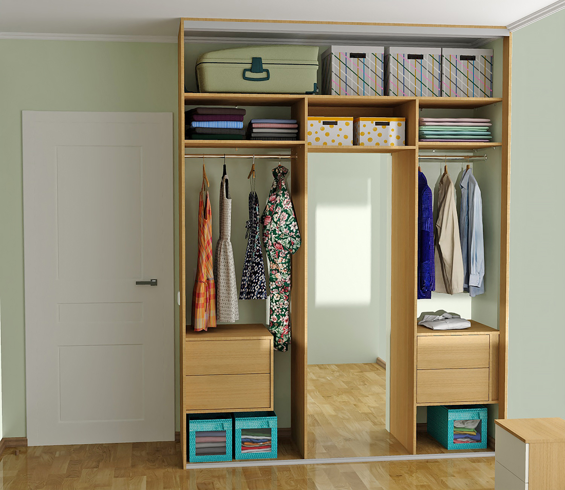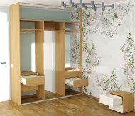 Плюс у такой мебели в том, что она сделана в едином стиле, из одинаковых материалов, по размерам клиента и смотрится комплектом. Вы вряд ли подберете в мебельном магазине шкаф в потолок с проходом по центру, две миниатюрные тумбочки по вашим размерам и столик со смещенной столешницей. Такое нужно заказывать.