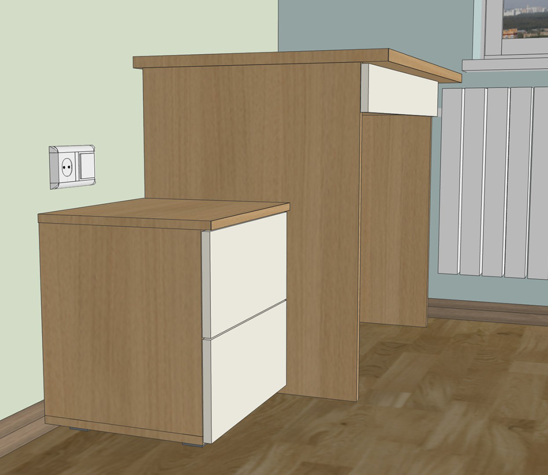 У столика мы сделали выдвижной ящик, но предупредили клиента, что из-за ящика возможно не получится положить ногу на ногу сидя за столом, не хватит высоты. Клиент с этим смирился, ему важней чтоб было место для документов.